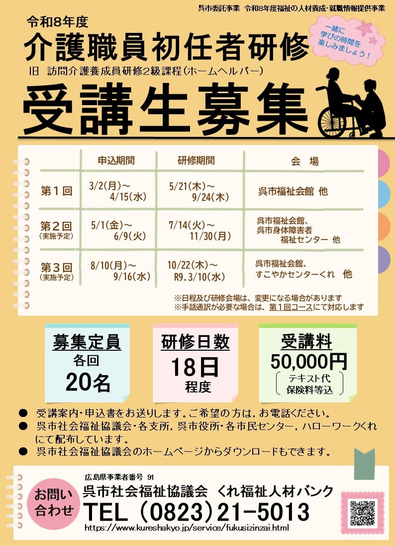 厚生労働省より許可(許可番号 34-ム-300009)を受け、「くれ福祉人材バンク」を運営しており、